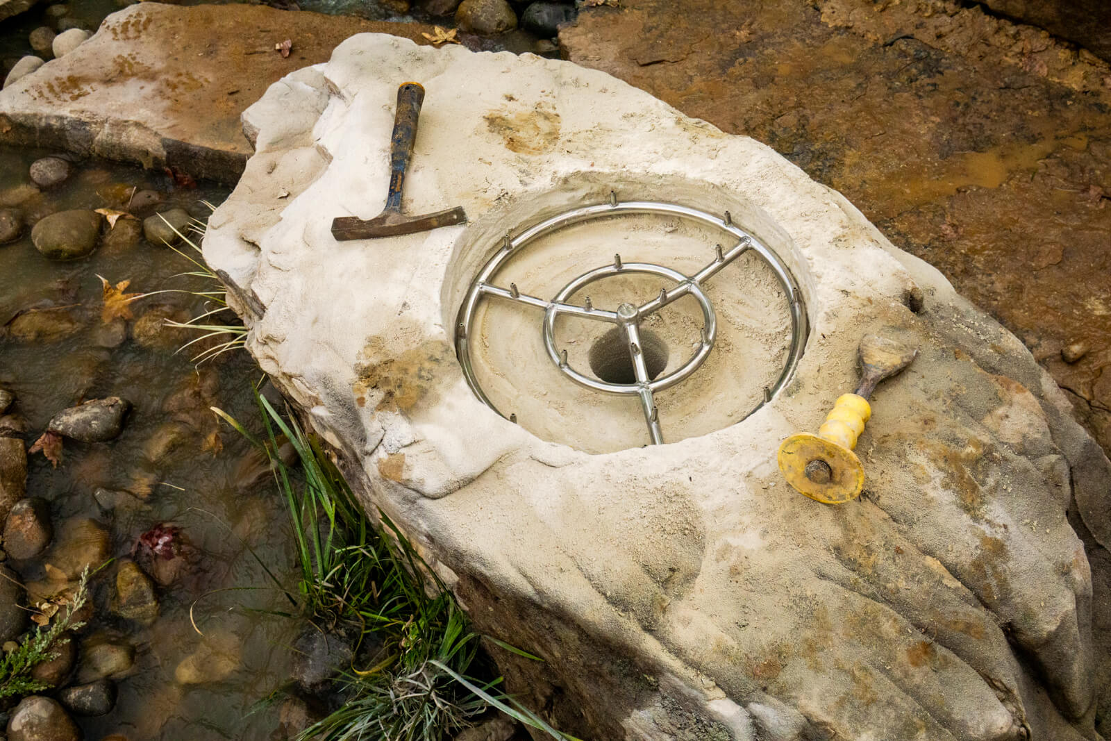 We built a pondless waterfall that flows naturally alongside the pool, turning the landscaping barrier into an integrated entertainment zone. Large stone seating boulders face the home and encourage conversation between the pool deck and cascading waterfalls. The centerpiece is a 2-ton natural boulder we custom drilled to create a custom fire feature that no store-bought fire pit can match. The underwater lighting beneath each waterfall produces a mesmerizing effect at night as the flowing water creates a flicker over the illuminated stones. The calming sounds from the waterfalls drown out neighborhood noise and passing planes and delivers the escape of nature without leaving home.
