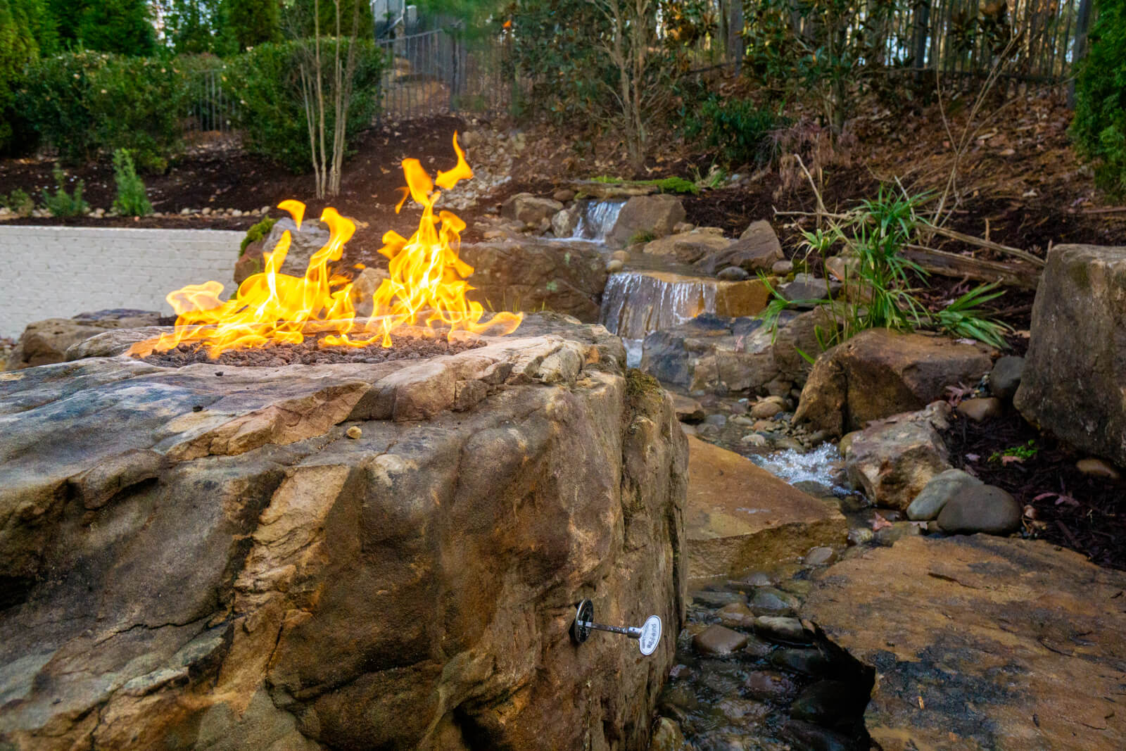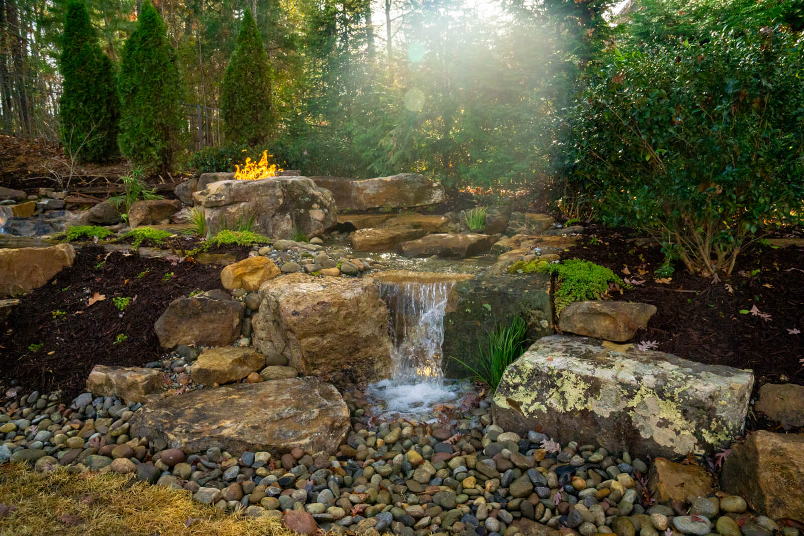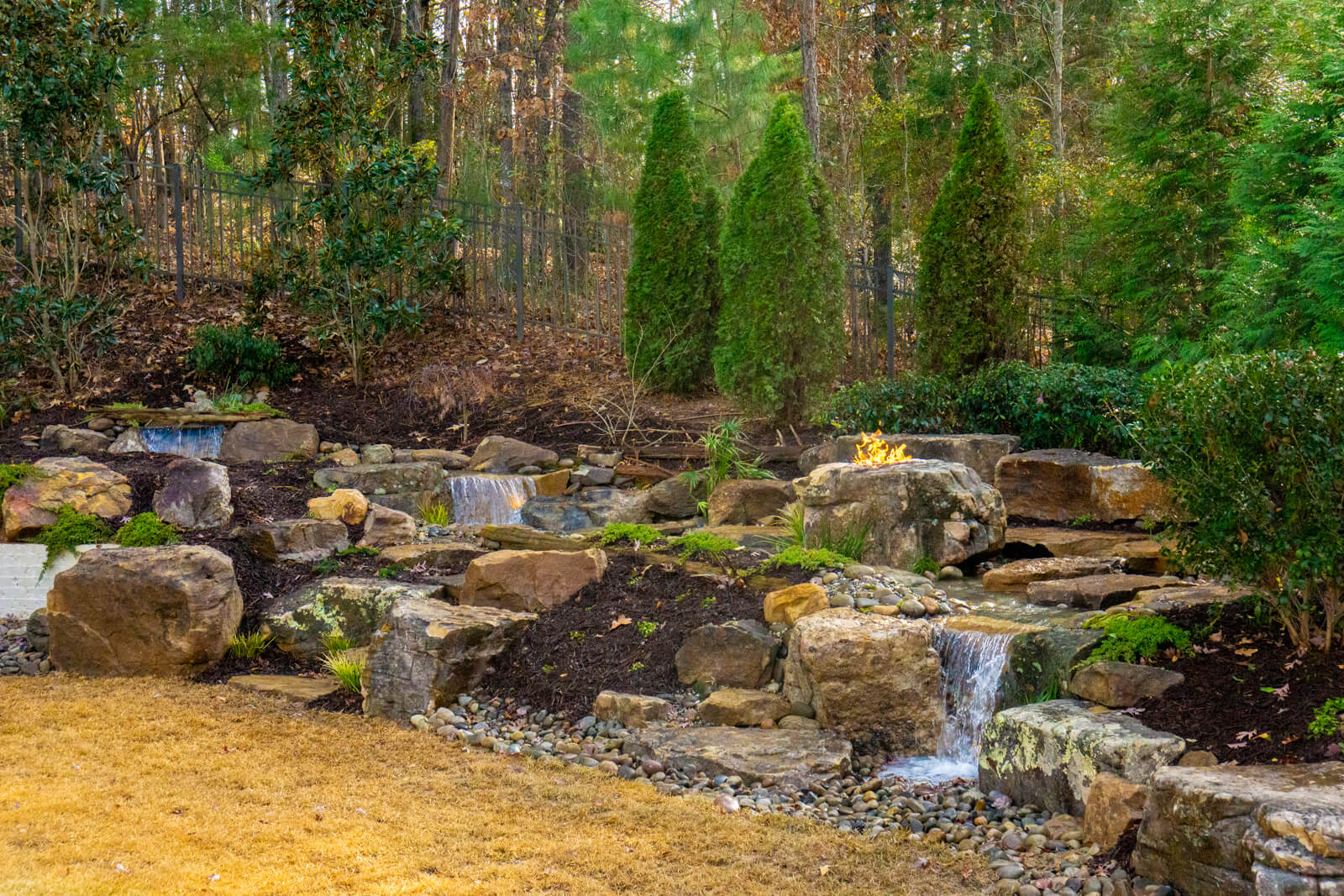 This Fort Mill client wanted a natural water feature with a gas fire pit that felt cohesive with the rest of their outdoor space. The existing landscaping created privacy but acted more as a barrier than usable space. They needed a design that would transform the area into a functional retreat while keeping the privacy, drowning out neighborhood noise and passing planes, and making them feel the escape of nature from the comfort of their property.