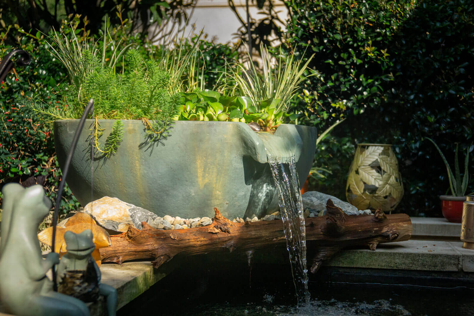 We installed an Aquascape spillway bowl with biological filter media under a filter pad, topped with gravel and planted aquatic plants to make it look more natural. We positioned stones and an accent log in front to lock the bowl into place and help the natural filter blend with the formal pond. The spillway bowl adds the soothing sound of cascading water while improving water quality for the koi through increased aeration, circulation, and biological filtration that keeps the water clear.